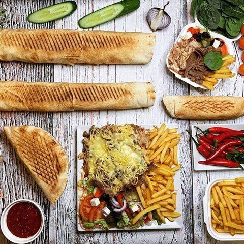 chlebek pita, mięso, warzywa, frytki, ogórek, sos -